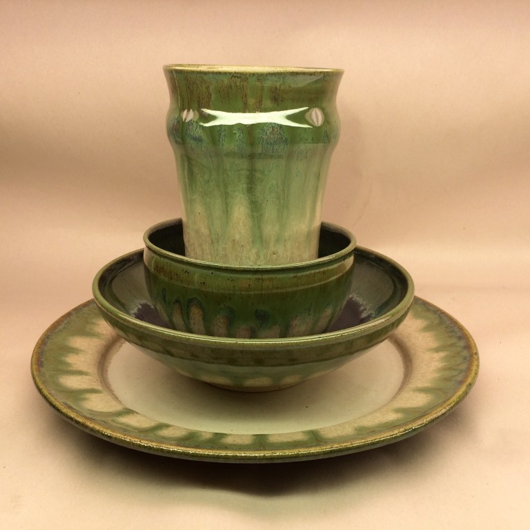 I decided that after the last year of practice I should begin to try and make pieces with intent. So here is an early example. A four piece place settingthat includes a dinner plate, a salad plate, a #1 cereal(/soup) bowl and a tall tumbler. It is glaze dwith a combination that I have used a couple of times already and each time it’s been met with a response that roughly equates to “oooh, I want that!”