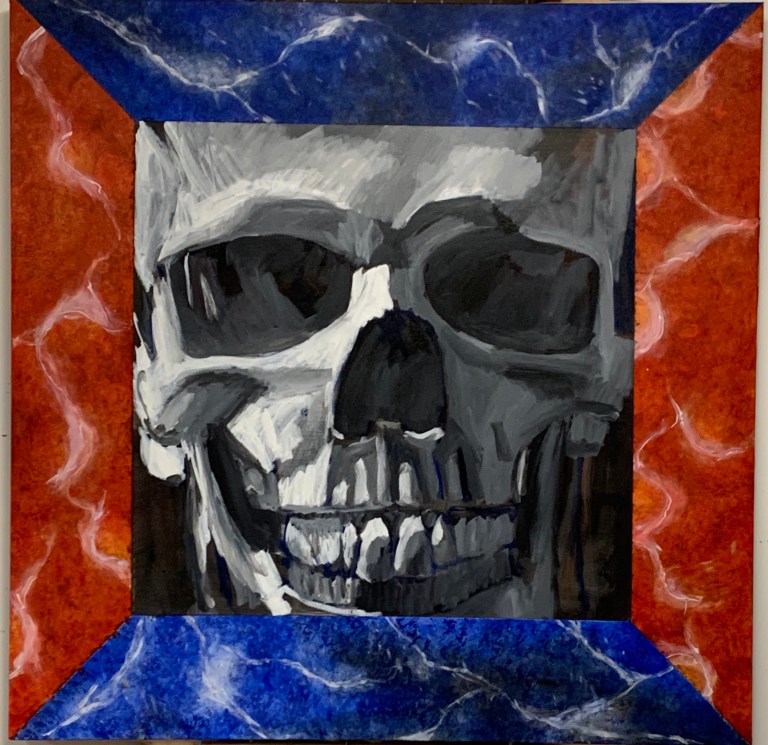 Still a long ways from done. Took the masking tape off just to see it all together. I worry that it looks a bit out of an overwrought teen’s poster collection…