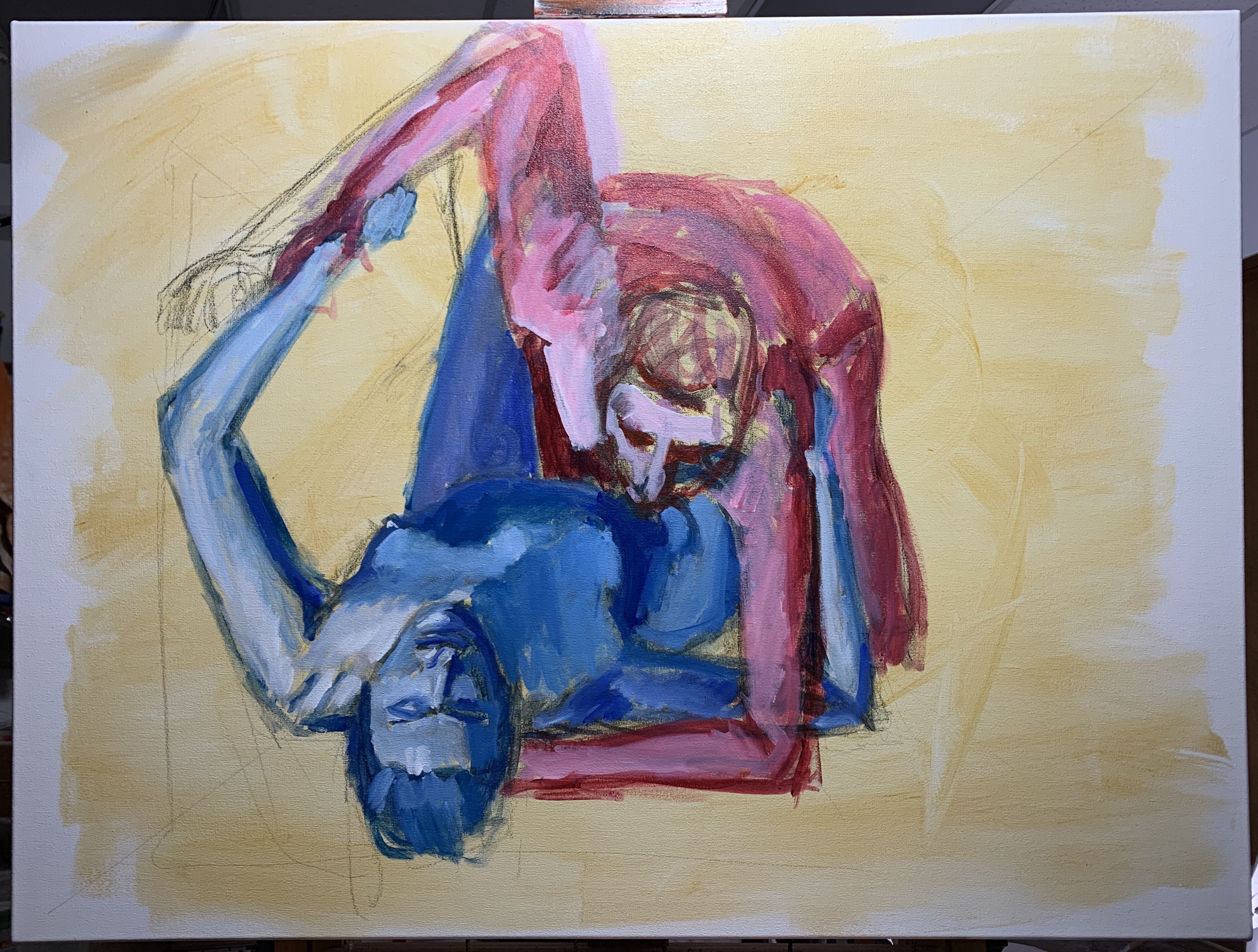 Started new painting today. Had a basic concept for a moment in time. Only had one model though, so alternated the two poses until the results filled the brief. Much reworking yet to be done. Happily I seem to have gotten all the limbs in the right places.