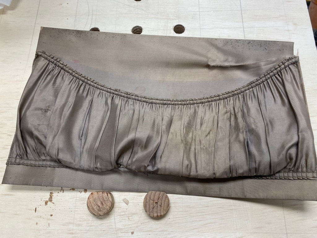 The side panels are similarly constructed. cardboard panels with a pocket sewn on and a nail used to reinforce the upper corners where the elastic is anchored.