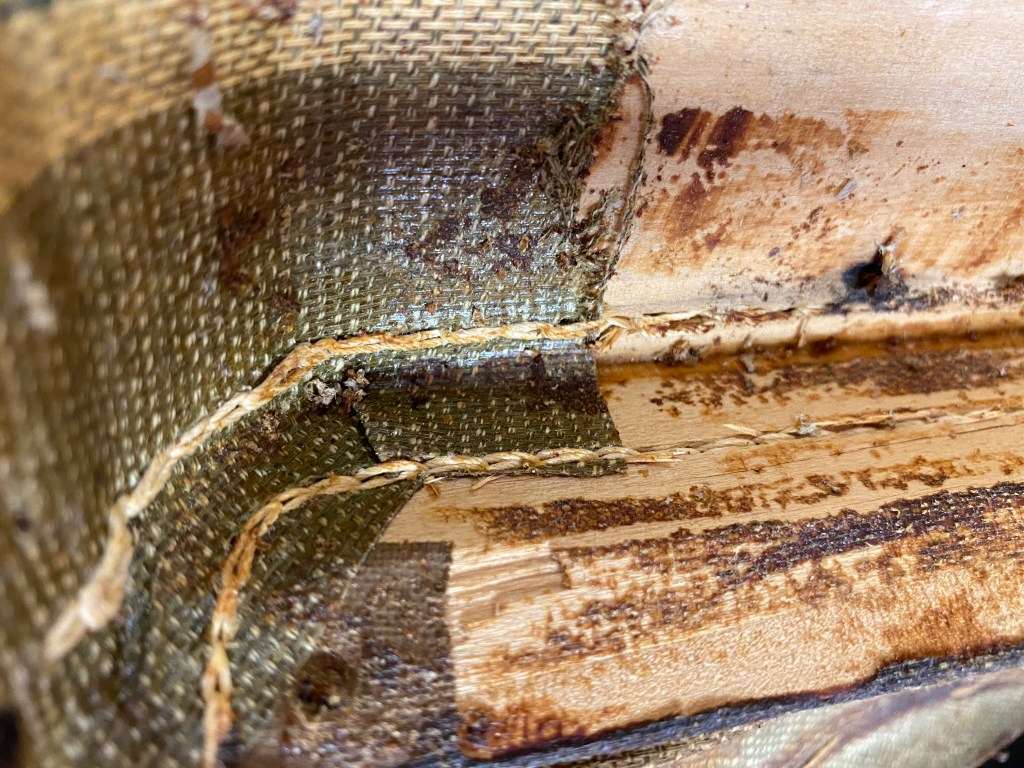 The really interesting part of this deconstruction is actually the external stitching. It turns out that while in the case of quite expensive luggage constructed of very thick leather, where the stitching may be of the box variety or the miter reinforcement type. the stitching in this case just goes right through the plywood.