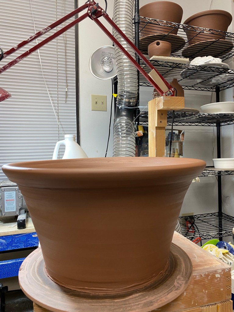 Per request, making some large flower pots. The requested dimensions are 12” tall and somewhere between 14” and 17” across. So far I have the width, but not the height. I’m thinking I’ll need to use the whole bag to get that big. This pot is a solid 18 pounds. And is only about 8” tall. Actually all three are about the same height. But the foreground one is a fair bit wider.