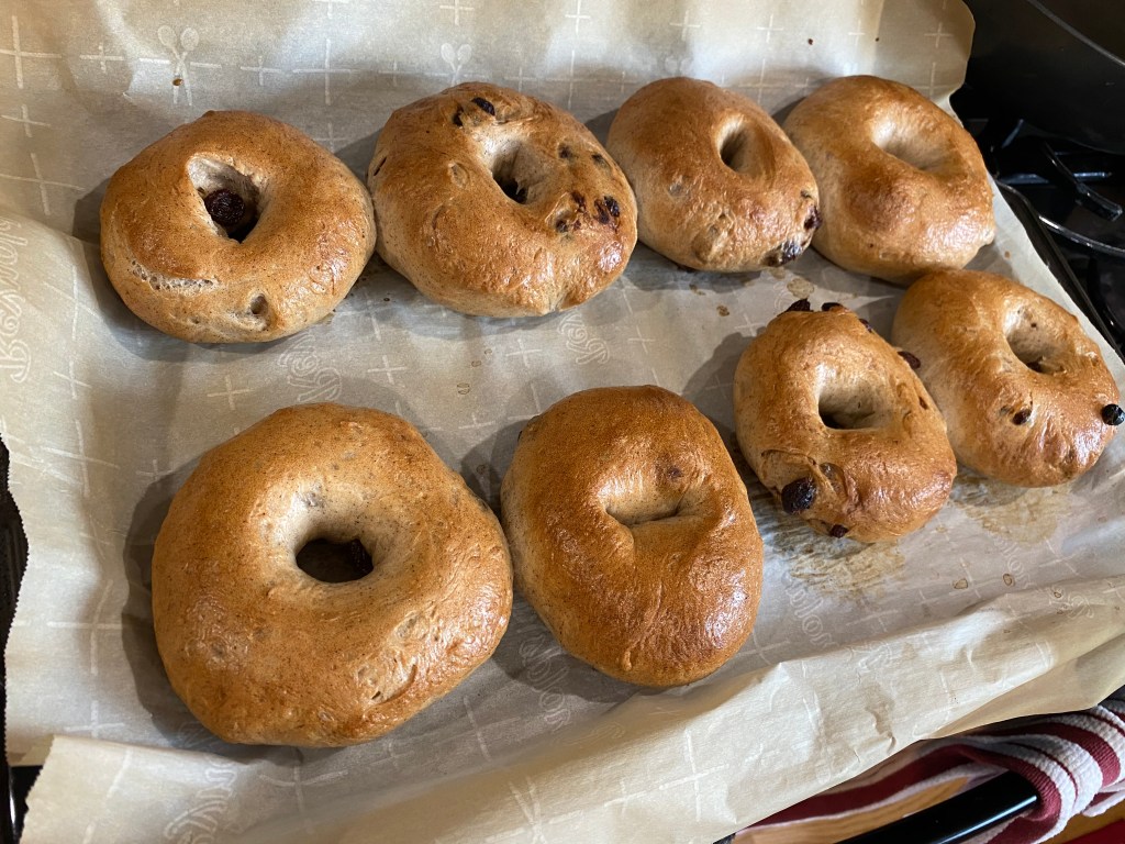 Optional note. turning these into cinnamon raisin bagels was a matter of dropping a teaspoon of cinnamon in the flour at the beginning and kneading about 3/4 cup of raisins into the dough at some point. I did it at the end, but in retrospect it might have been worth while to drop them into the flour at the beginning so that they would dredge in the flour and the dough might stick to the raisin better. I leave that as an exercise to the reader.