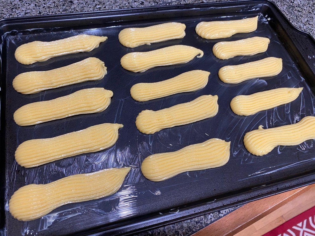 Note that some came out a bit bone shaped. Try hard to avoid that. It isn’t the end of the world, but it cuts down on the space available for stuffing. Note the number and size of the edges in the surface. it really pays to have the right kind of piping tip in the pastry bag.