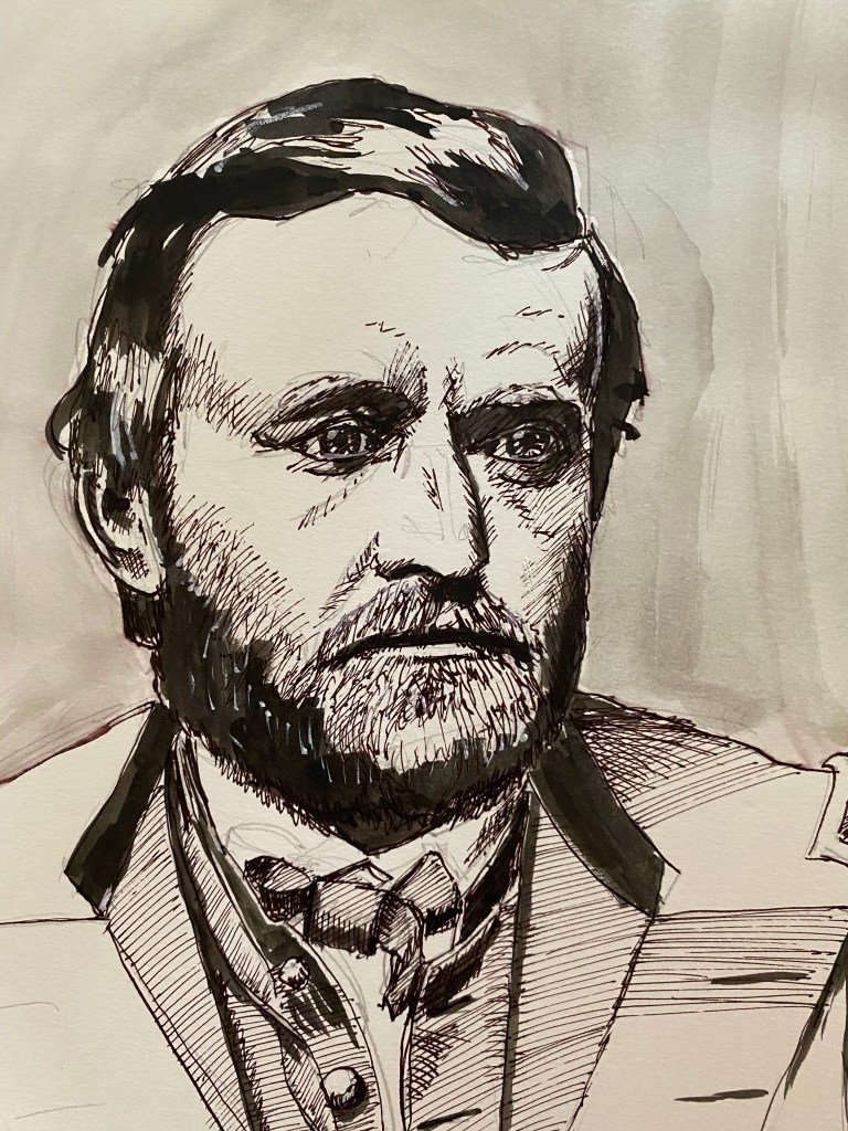 Simple attempt at drawing Grant. not terribly successful. especially the eyes. I think an earlier version without the wash in the background worked better, but still not particularly good. Manages to look both mournful and freaked out…