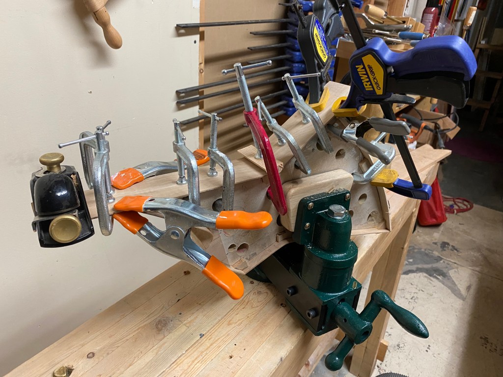 I do have to finish with a plug for the Grizzly tools patternmaker’s vise you see holding up the ukulele mold. It is held down to the workbench with a screw that happily fits a 3/4″ dog hole perfectly. Worth every penny, I recommend it unreservedly. And for what it’s worth that is unsolicited, I paid for it.