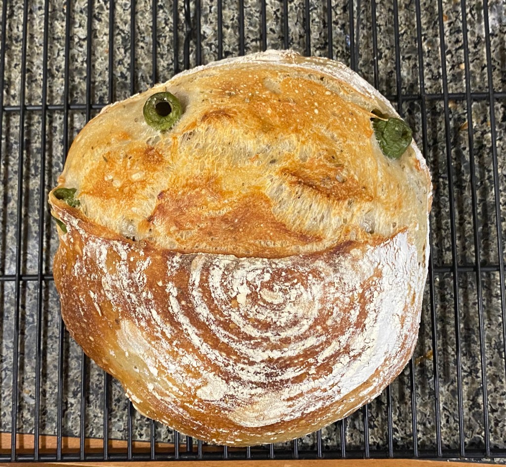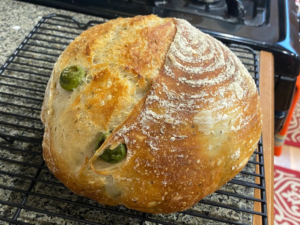 This was baked inside a cast iron pot for the steam, and I have guess it was the damp olives that provided a bit of extra, as this was the best oven spring I’ve ever gotten.