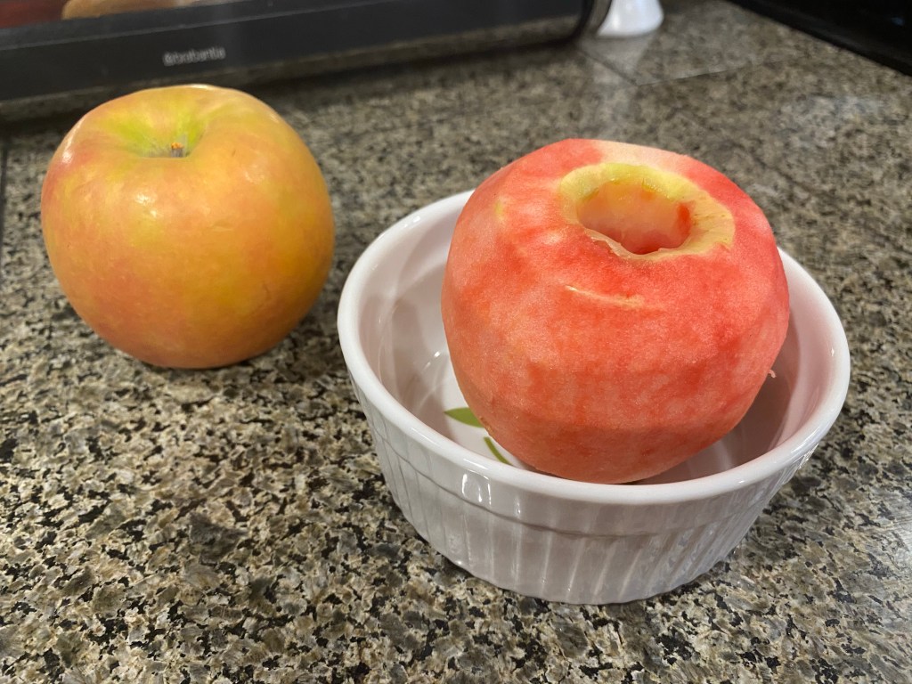Cooked, much of the character and flavor are gone. I do think that adding one of these, sliced thin, to a pie filling would add a pleasant visual element to an otherwise monochromatic filling. Indeed, as it was still crisp after 40 minutes, it could add texture as well, but I wouldn’t want it to be the focus apple.