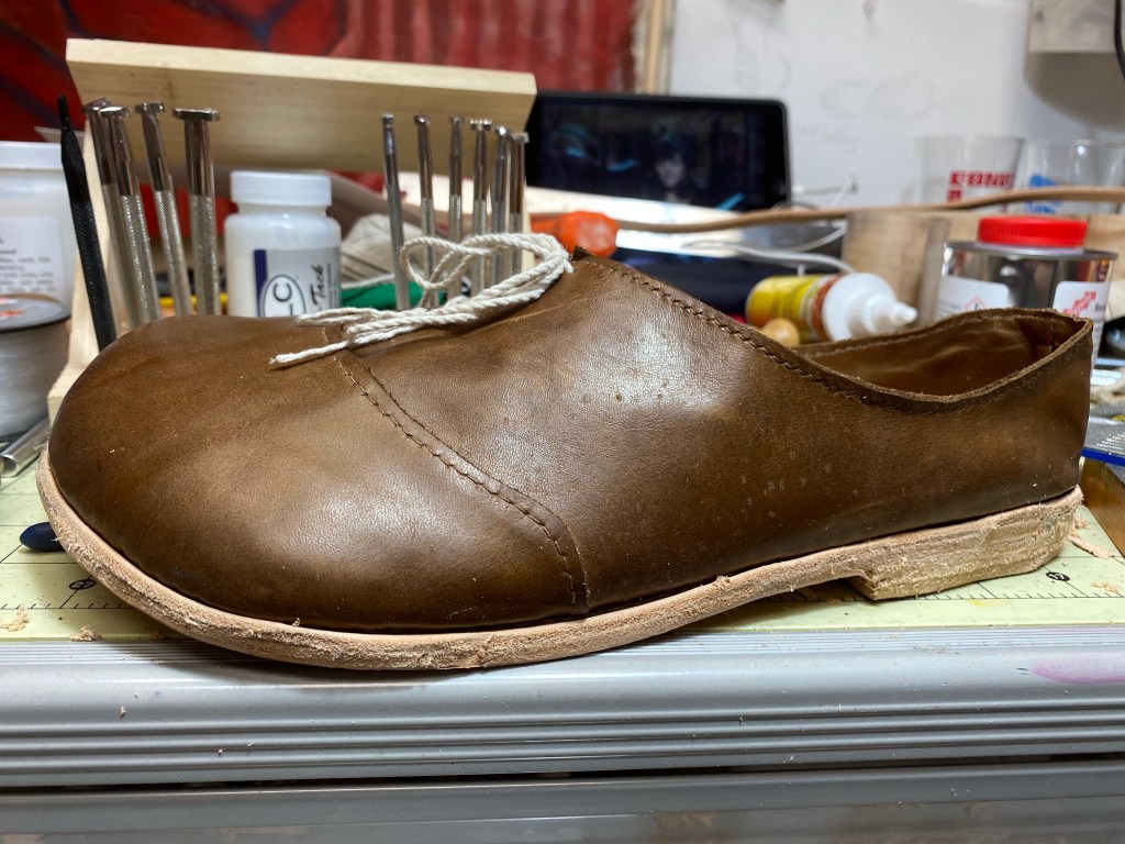 Only one so far, wasn’t going to waste the leather on a whole pair until I felt pretty good about how the first one came out. As you can see, not terribly well for a first attempt, but as said in some rather famous words, “I’m pretty sure I know what I did wrong!”
