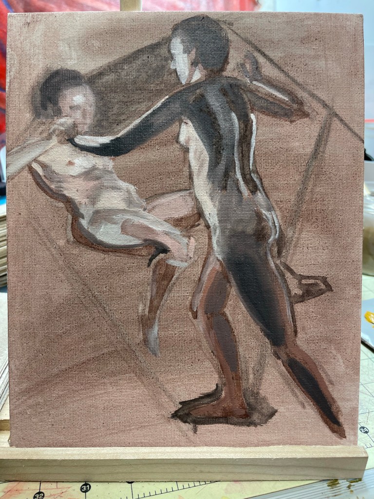 Practice session for a larger work, based on the last model session, (first one in well over a year! (For the obvious reasons…)) A composition combining two renditions of the same model in different poses.
