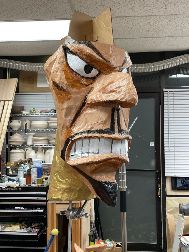 again, skipped over a bit here. the most interesting part of the intervening work was the eyes. for those, I took a rubber bowl, (which I should have covered with some Saran Wrap first, but I didn’t have any.) and built up 6-7 layers of tissue paper and acrylic medium (not gesso this time, the medium has much more plastic in it.) on the outside of the bowl, and when that had dried, peeled the resulting form off the bowl and cut it out so it would fit just inside the eye socket. then used more tissue paper to bridge the gap and glue the eyeball into place. you can sort of see the convexness of the eyes.