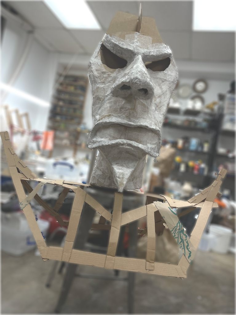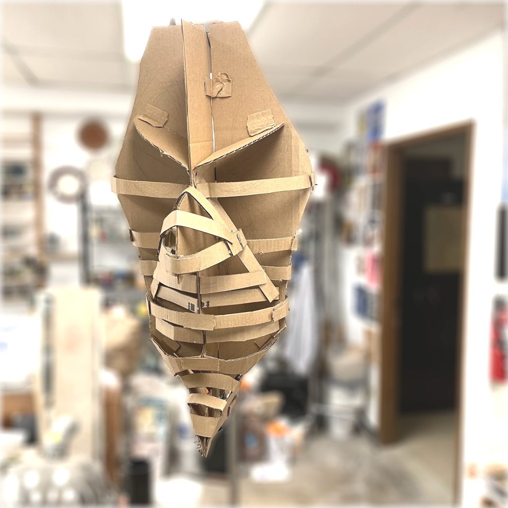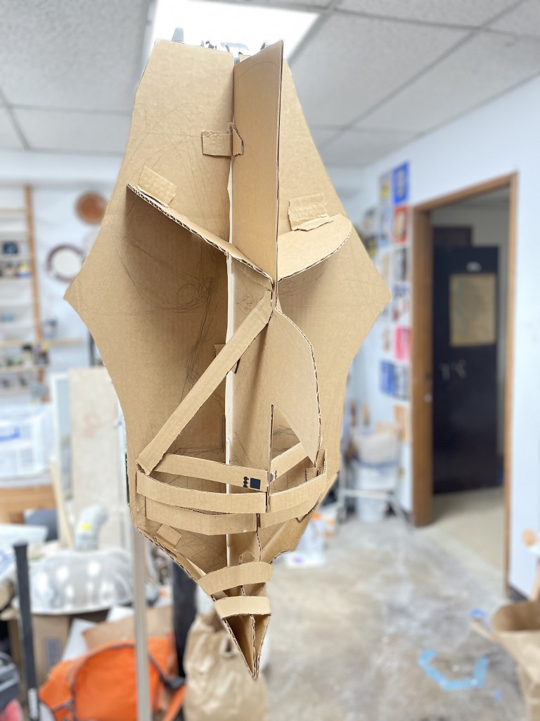 Started with a simple frame of corrugated cardboard and a lot of hot glue. roughly sketching in the framework of the major features.
