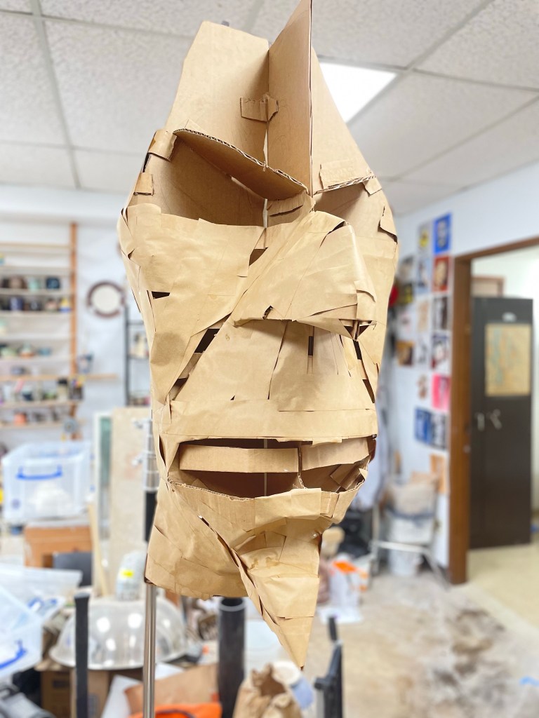 Needed a shoulder unit to bulk out the body, again not permanently affixed until installation. I did fill in some of the larger gaps with more cardboard or cut up shopping bags, before moving straight on to the tissue paper. it might have helped a lot to have used the tape here as well, but I was running up against time.