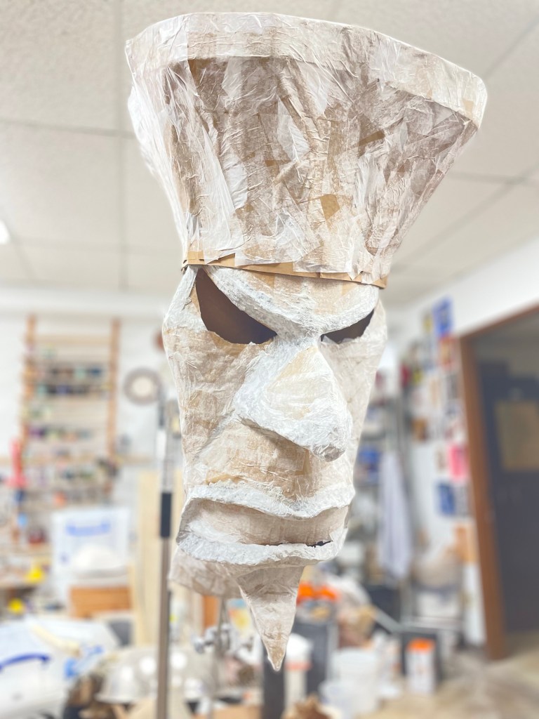 I picked up a package of premade paper ‘clay’, (a phrase that has many definitions, here it means a chopped cellulose with a water activated glue. molds like clay, but purely ground up paper.) which comes in a slab that you break up and add a quart of water to. when it’s all wet, you get a paper goo that has similar properties to clay, but a bit more fibrous, that you can just mold into a shape and wait for it to dry. I used that for filling in the lips, rounding out the nose and the eyebrows… And wait, and wait…