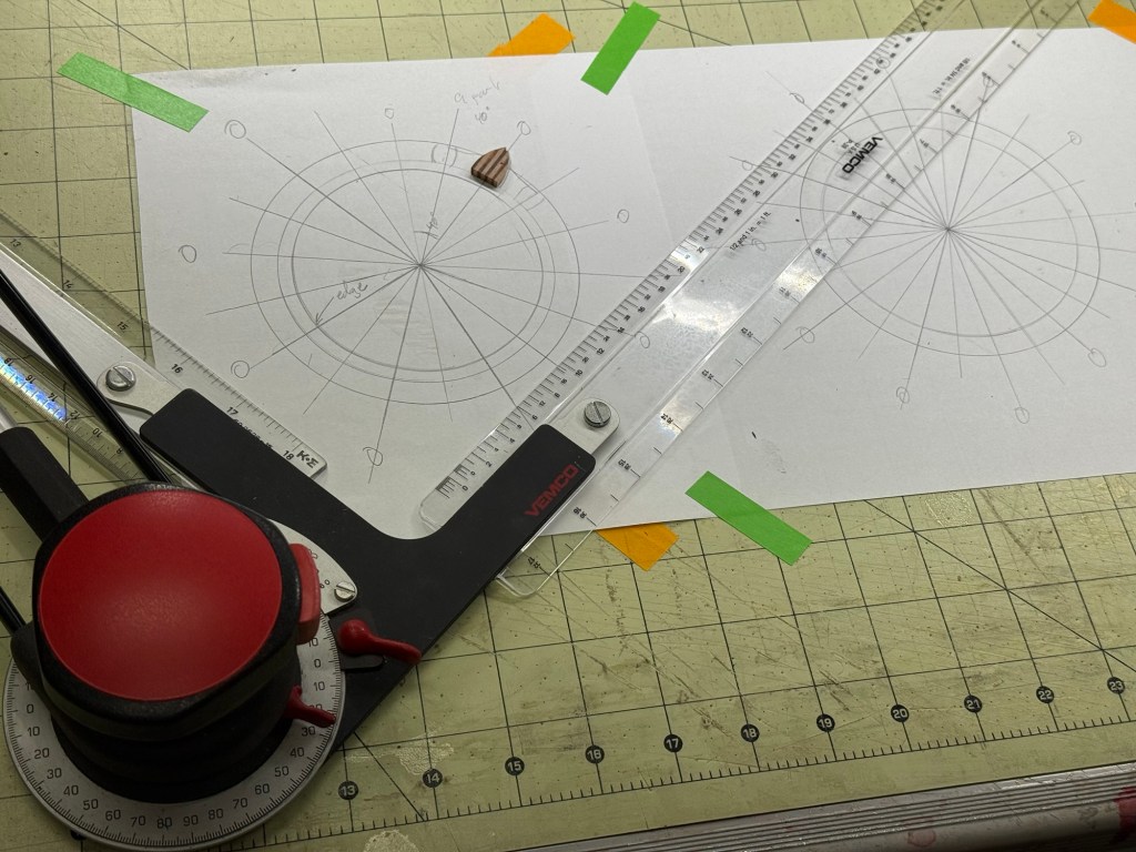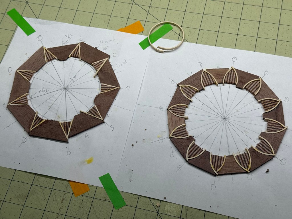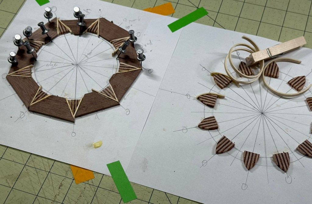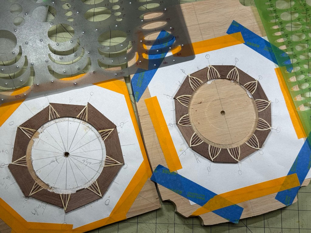 Step 2 is to add the cardinal points. I have some leftover layered stock from the renaissance guitar I made a while back. Made of maple and bloodwood for a nice color contrast. These are glued directly to the paper, since that can be pretty easily scraped off when I’m done.